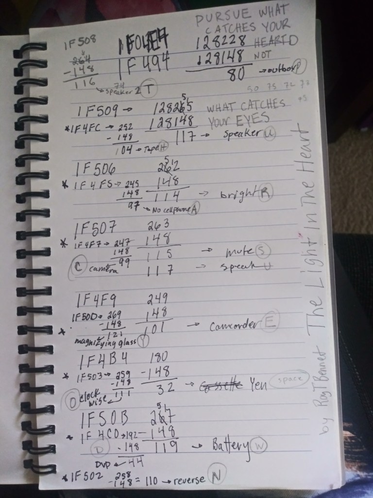I carefully read the decoded phrase again. “Pursue what catches your heart, not what catches your eye…” Well. Um. The first half of it was five words. I tried it.